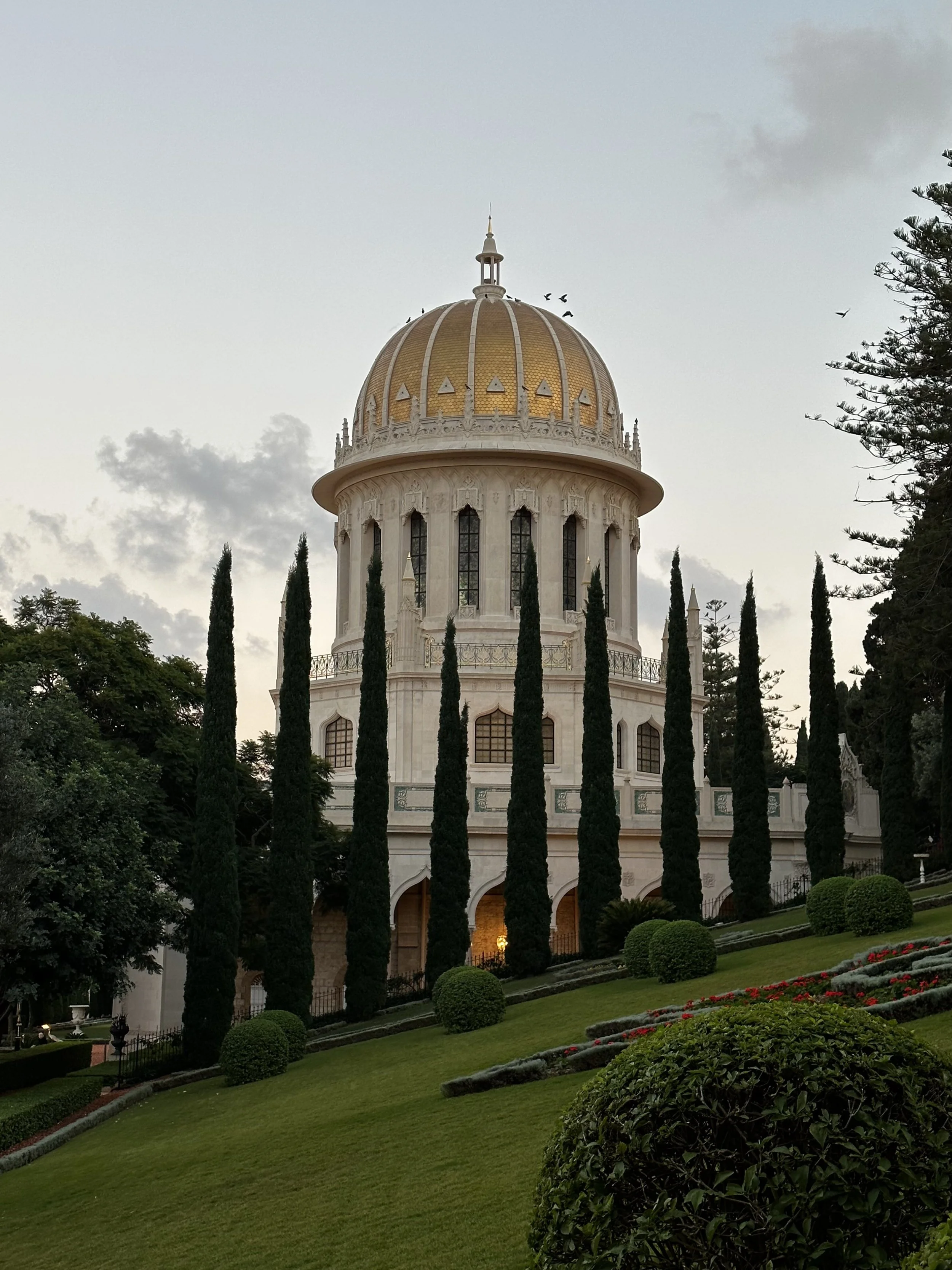 I still remember the sound of the smooth river stones rubbing against each other as my feet pressed against the ground. I still remember the yellow and white jasmine flowers falling effortlessly to the ground as the wind rushed past the leaves and branches of the trees. I remember the feeling of the smooth yet worn marble floors on the soles of my feet as I walked between the colonnades. I remember the piercing sound of the crows wailing at each other. It was a reminder of the discord the existed in the outside world. The archways and the corinthian columns became a physical representation of the peace and solace my mind had from those thoughts here. As my eyes became fixed on the city I noticed the how cars on Carmel Avenue rushed past each other, as if they were numb to the beauty of the mountain. The cargo ships, enormous in size, were comparable to tiny stokes of paint on the ocean and sky’s shared canvas. As my gaze went past the sky I felt a sense of singularity, as if of all the places on the entire planet, of all the moments in time, I was supposed to be standing here. One step at a time I approach the white metal doors, my hand skimming across the coarse stone walls as I slowly paced. The rough brown stone and the smooth white metal provided a stark yet delightful contrast just as the city itself and the surrounding gardens provided that same contrast. The smell of rose water radiated out of the door, as if the molecules themselves infused with a special happiness, a happiness which I also shared.